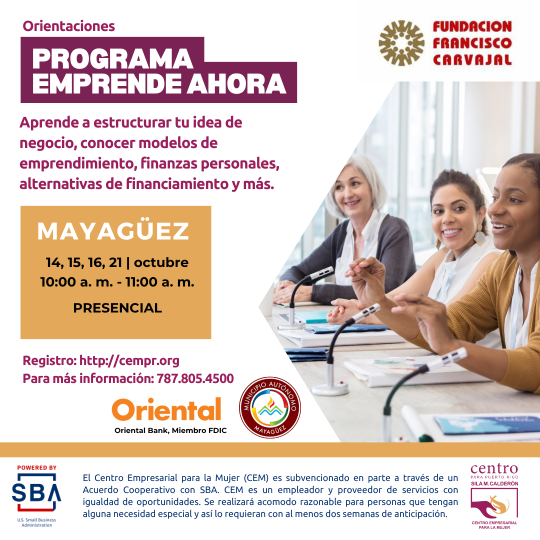 16 October @ 10:30 am - 11:30 am AST Orientación presencial | Programa Emprende Ahora | Comunidad Leguizamo, Mayagüez